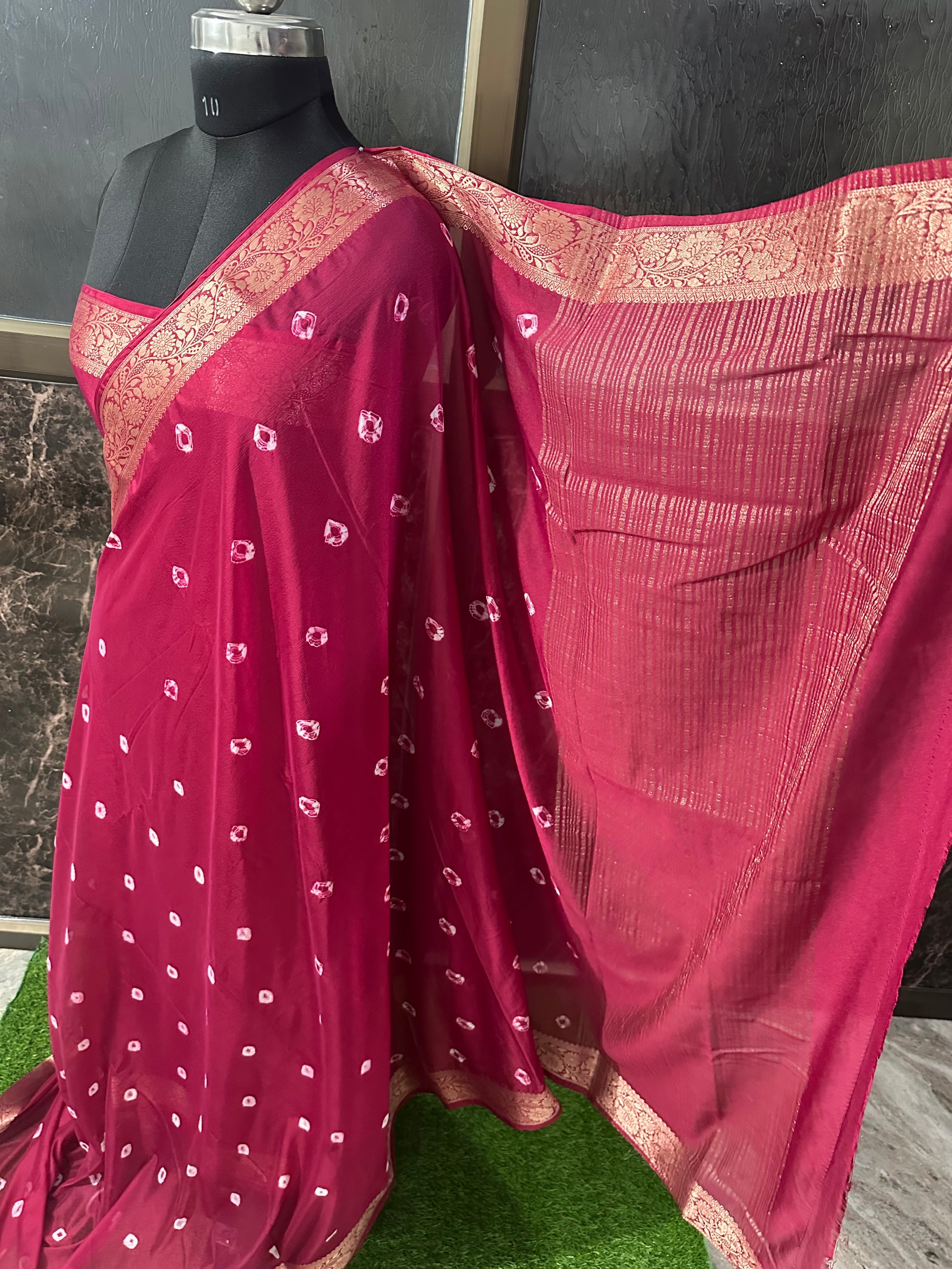 EXPERIENCE UNPARALLELED ELEGANCE WITH THE NEVER SEEN BEFORE CHIFFON BANDHANI SAREE. CRAFTED FROM EXQUISITE CHIFFON , IT FEATURES A ZARI ADORNED PALLU AND A COORDINATING BLOUSE THAT TOGETHER CREATE A REFINED AND SOPHISTICATED ENSEMBLE.