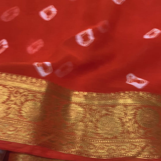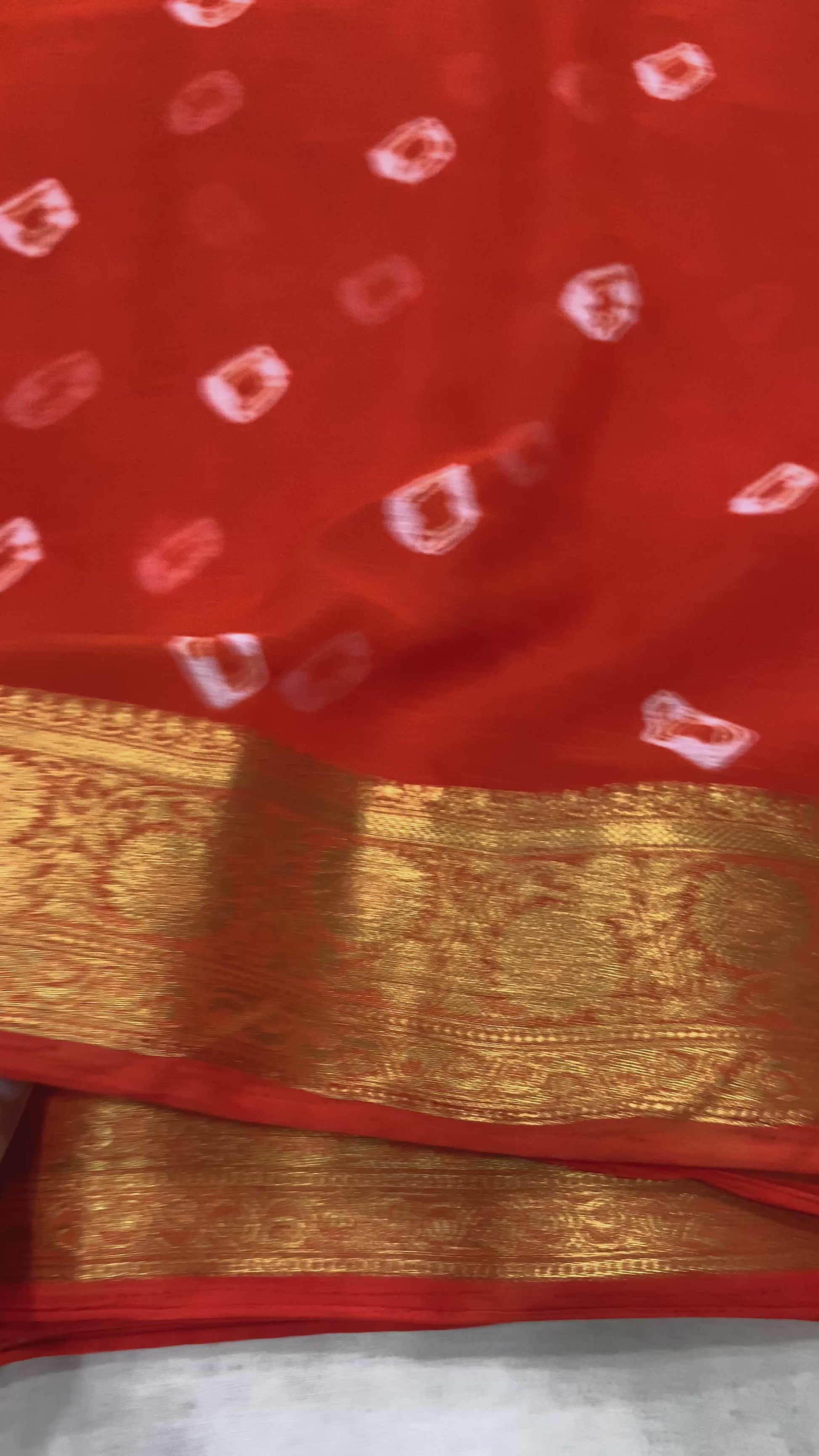 EXPERIENCE UNPARALLELED ELEGANCE WITH THE NEVER SEEN BEFORE CHIFFON BANDHANI SAREE. CRAFTED FROM EXQUISITE CHIFFON , IT FEATURES A ZARI ADORNED PALLU AND A COORDINATING BLOUSE THAT TOGETHER CREATE A REFINED AND SOPHISTICATED ENSEMBLE.